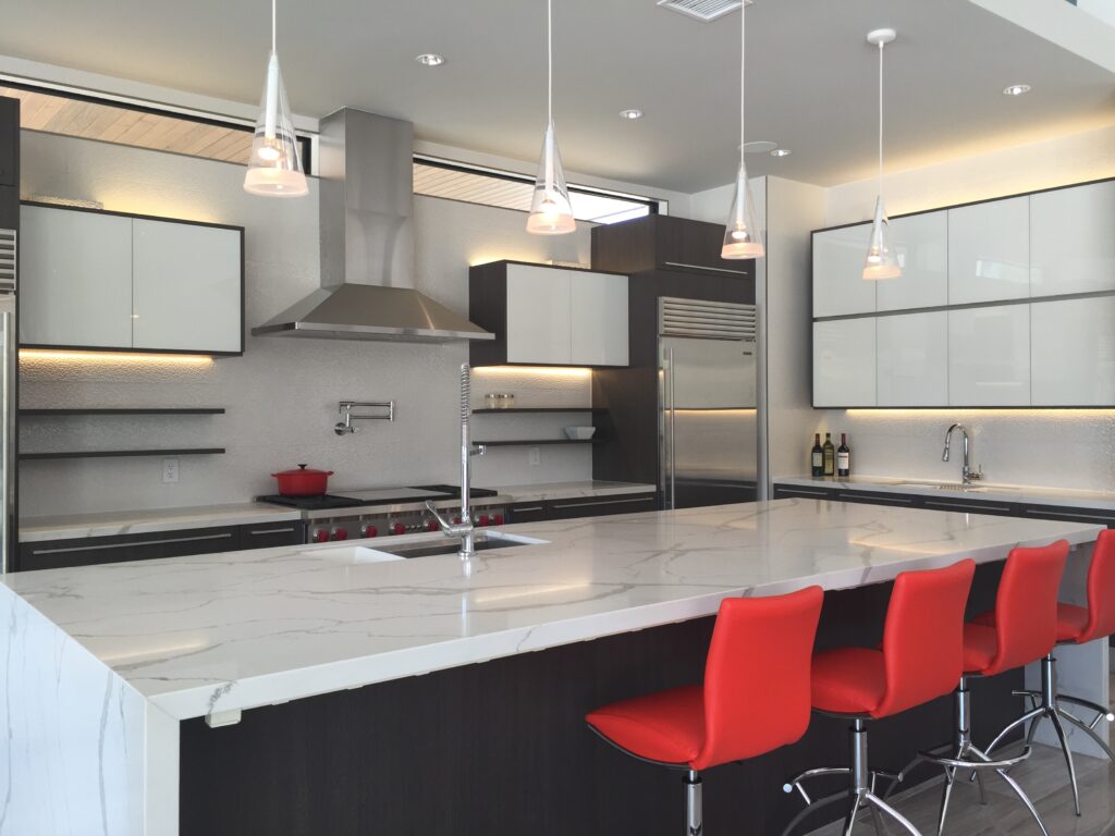- Add a sculptural element — a statement pendant, architectural vent hood, or custom handle design.