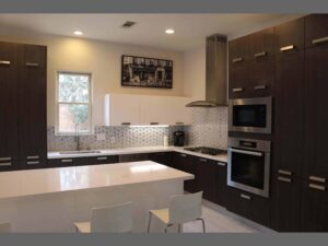 Houston’s humidity demands durability. European kitchen cabinets often utilize engineered wood cores, advanced laminates, lacquered finishes, and precision edge banding designed for long-term stability.